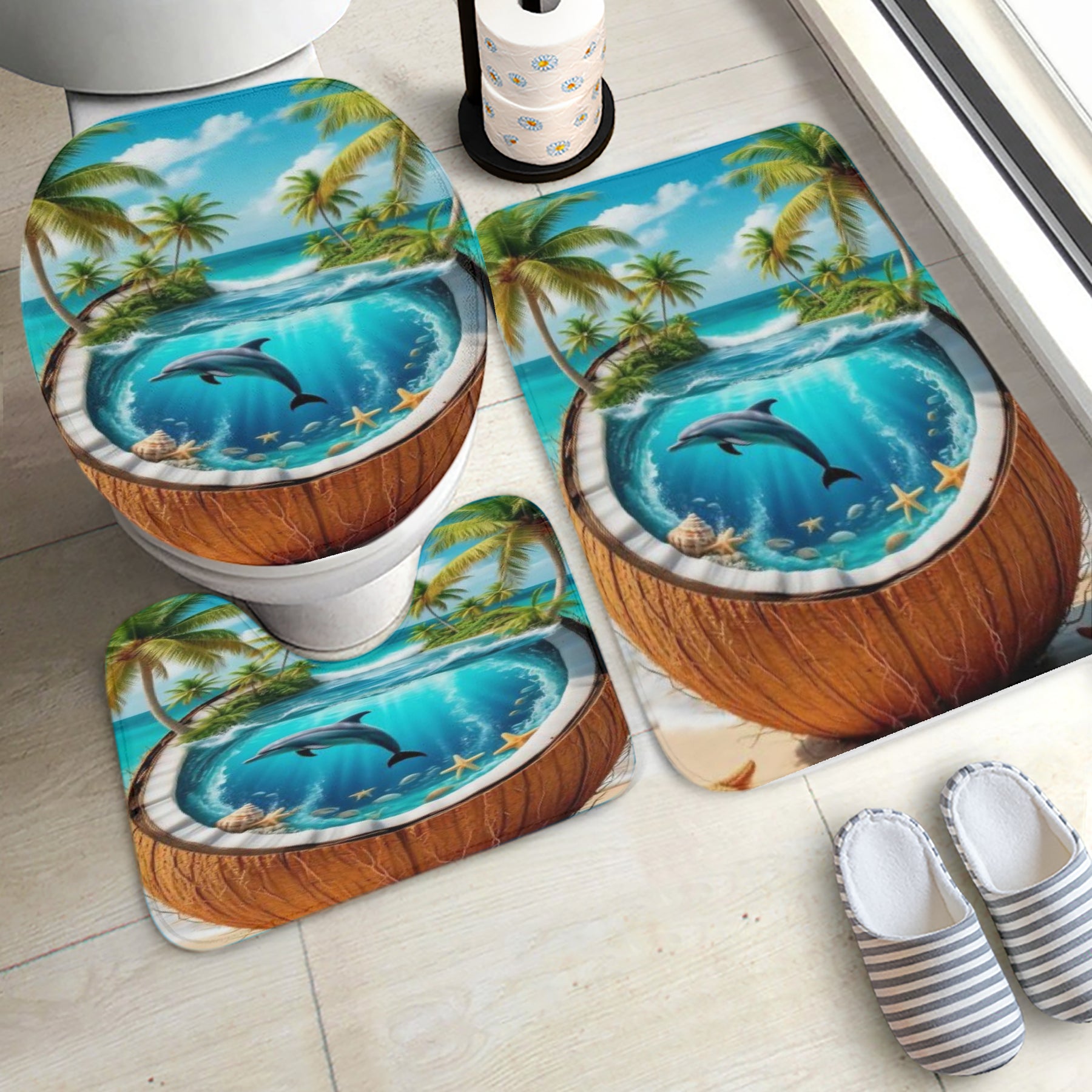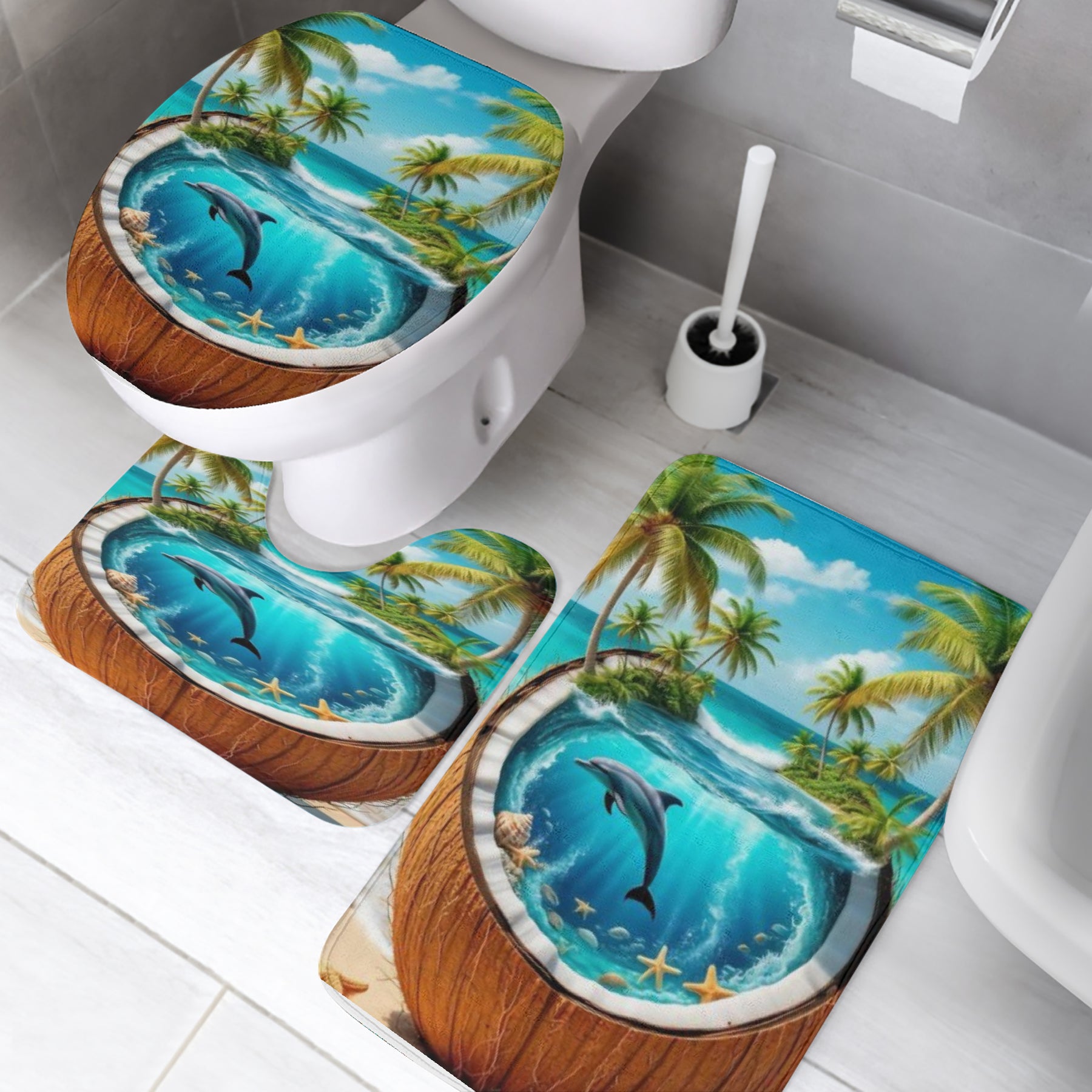 Elevate your daily routine and step into a world of tranquility with the Tropical Coconut Dolphin 3 Pcs Toilet Rug Set
