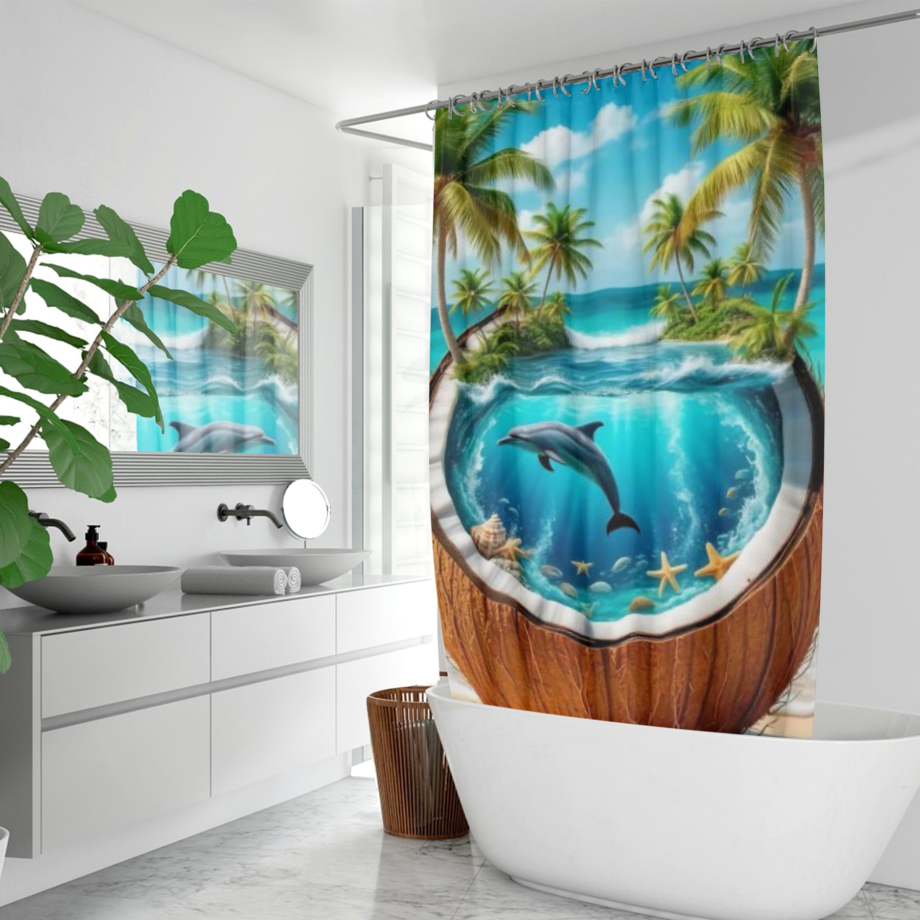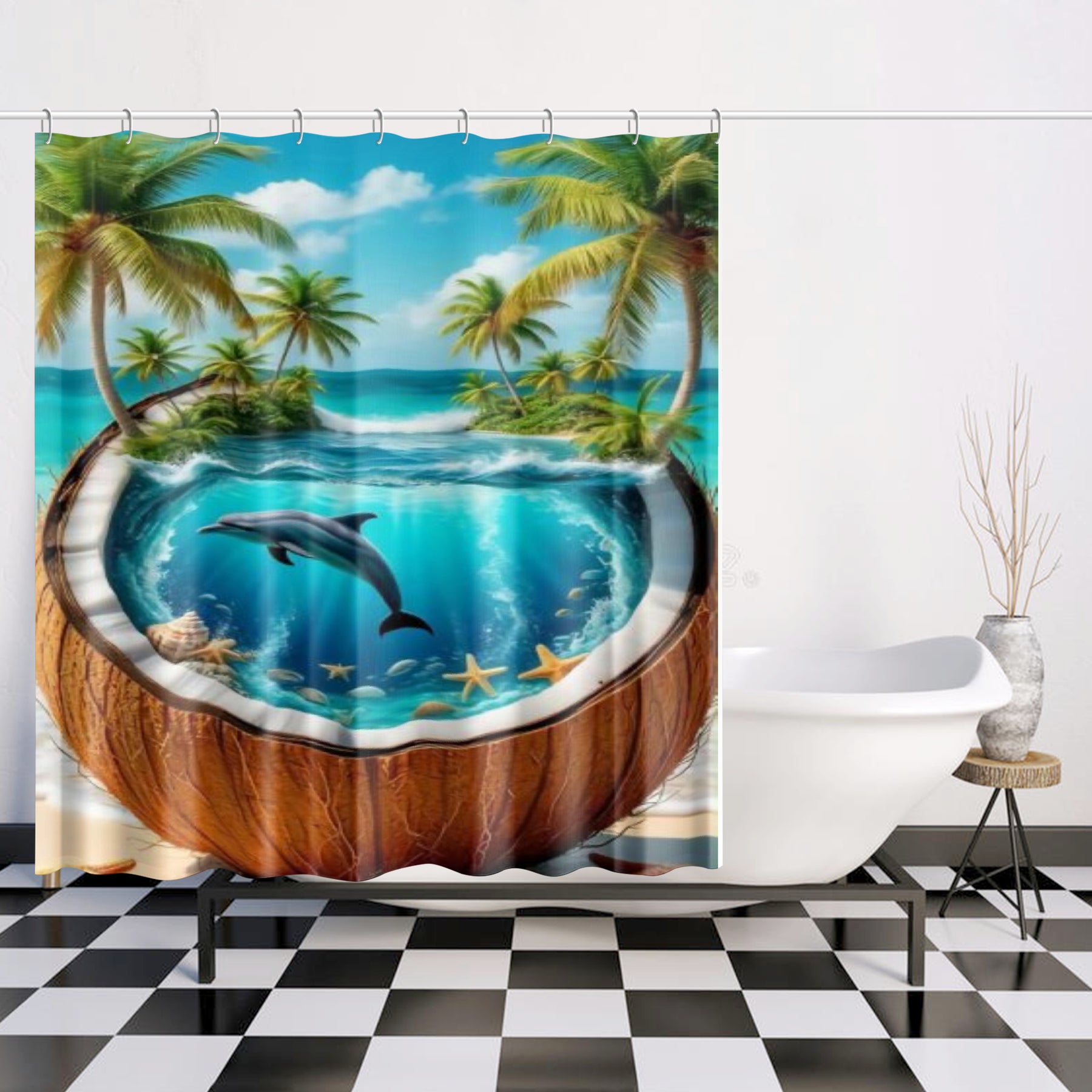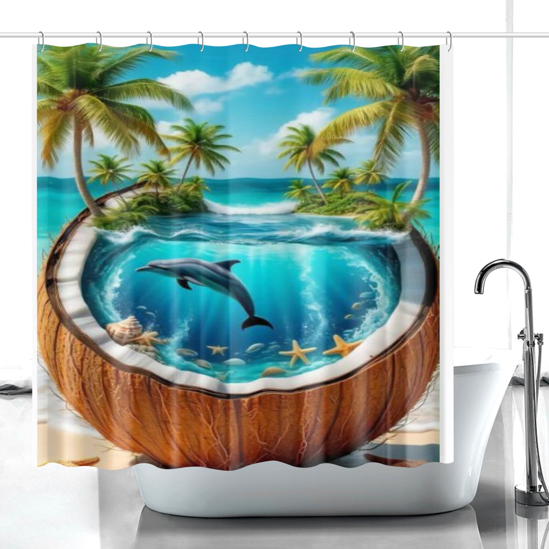 Designed to be as functional as it is eye-catching, this Tropical Coconut Dolphin Quick-drying Shower Curtain features 12 stitched buttonholes reinforced with durable metal grommets, plus hooks included so it’s ready to hang in moments. 🧺✨ Its sturdy, high-quality build ensures long-lasting durability, while its easy-care fabric makes cleaning a breeze—just machine wash warm on a normal cycle (no bleach or tumble dry). 🌼💧 Perfect for dolphin lovers, tropical dreamers, and ocean enthusiasts, this curtain transforms your bathroom into a joyful island escape filled with sunshine, sea breezes, and good vibes. 🌊🐬🌴💫
