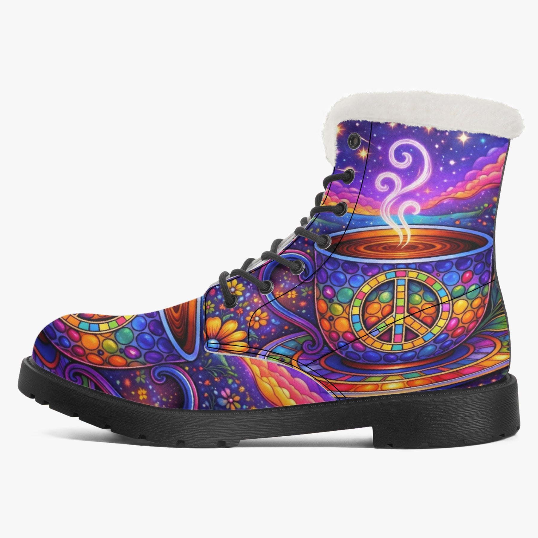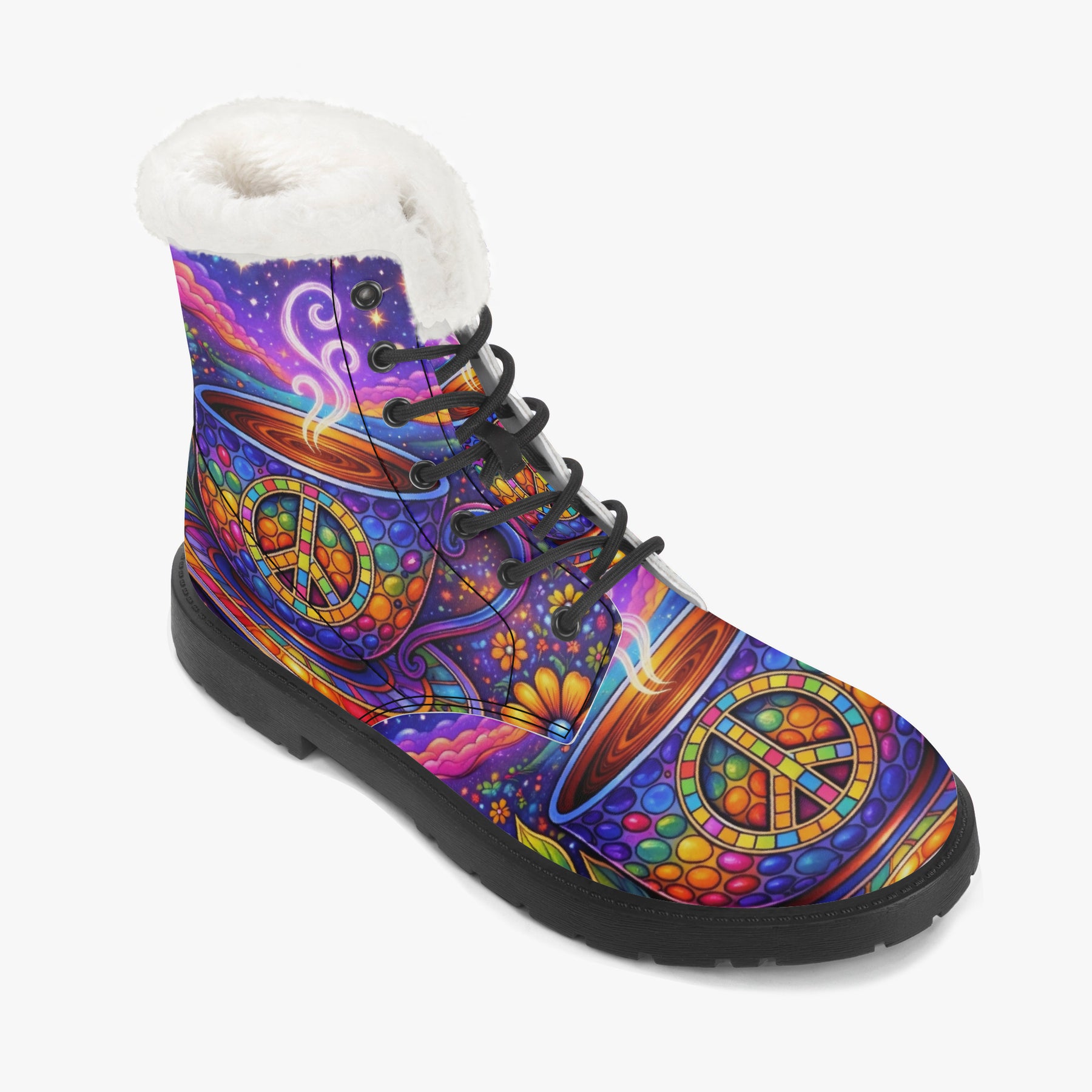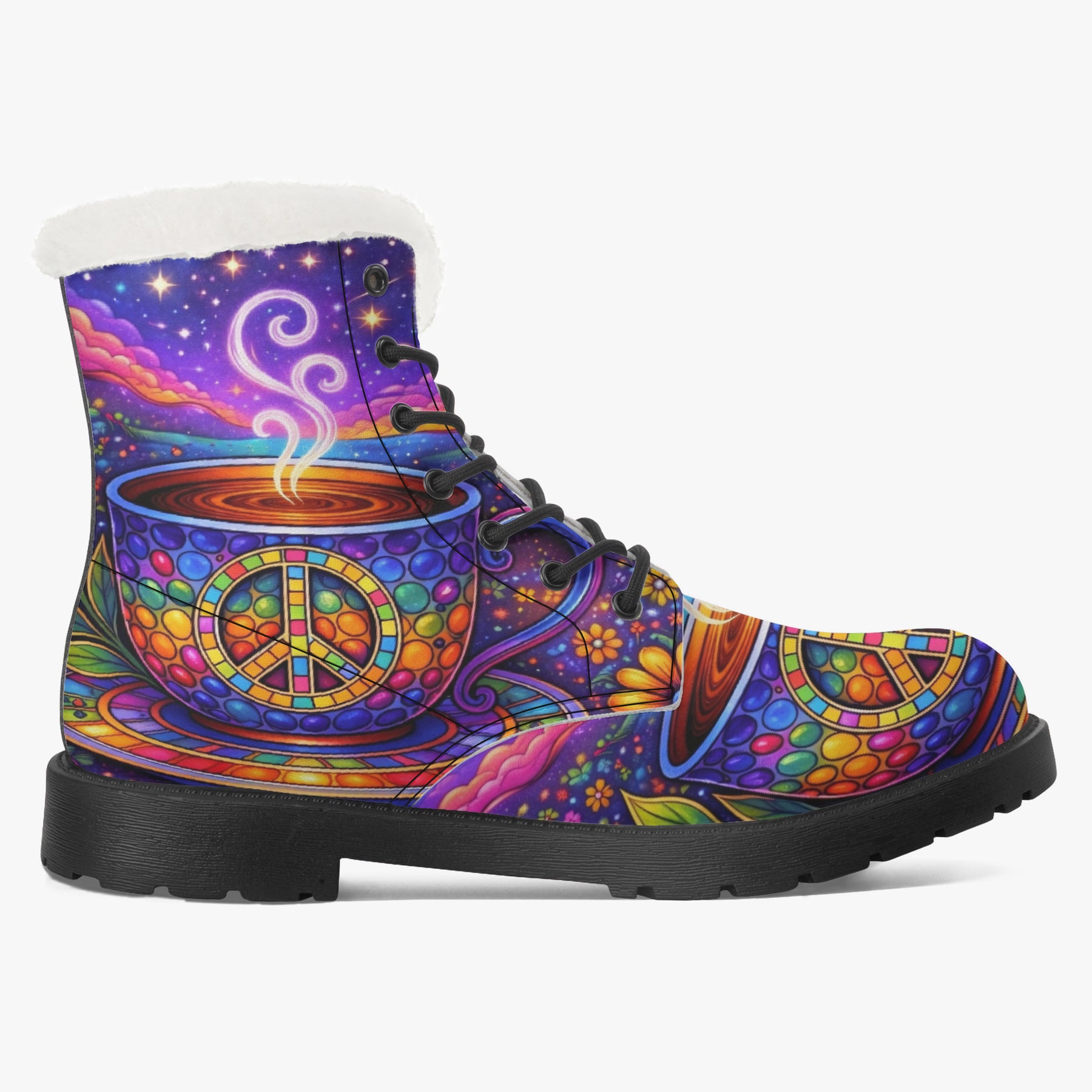 Wrap your feet in colour, calm, and conscious vibes with the Hippy Tea Cup Faux Fur Boots. Featuring radiant mosaic peace symbols, swirling steam, and dreamy cosmic florals, these boots bring warmth to your steps and light to your journey. Lined with soft sherpa and designed for everyday magic, they’re perfect for chilly mornings, sunset walks, or slow café days—inviting you to move gently, stay grounded, and carry boho bliss wherever you roam 💛🌿