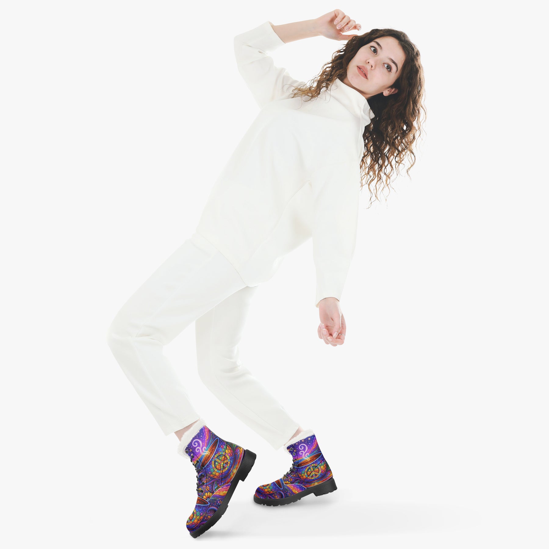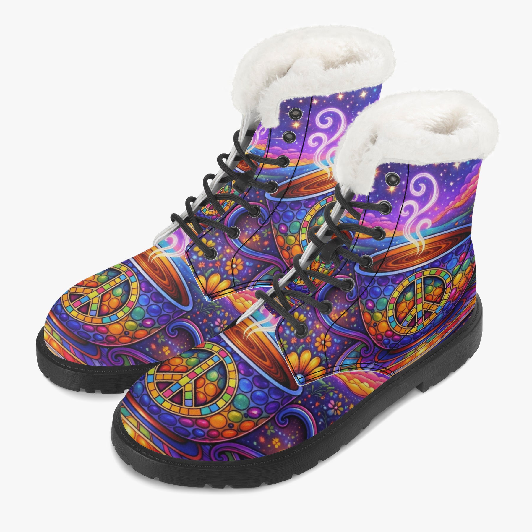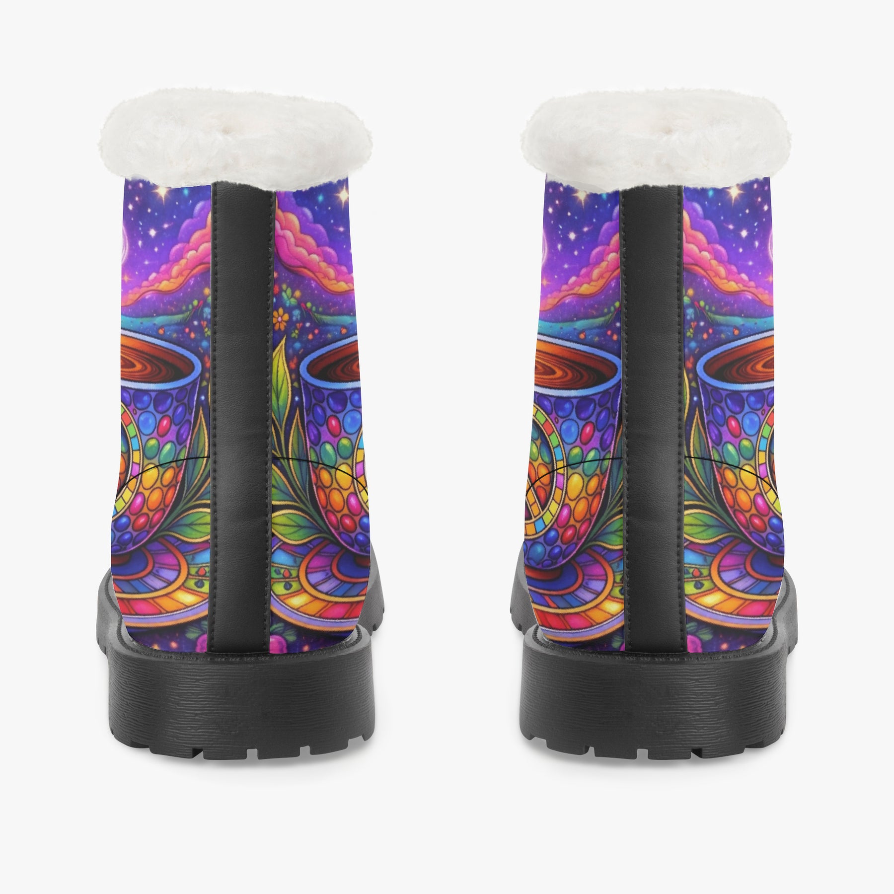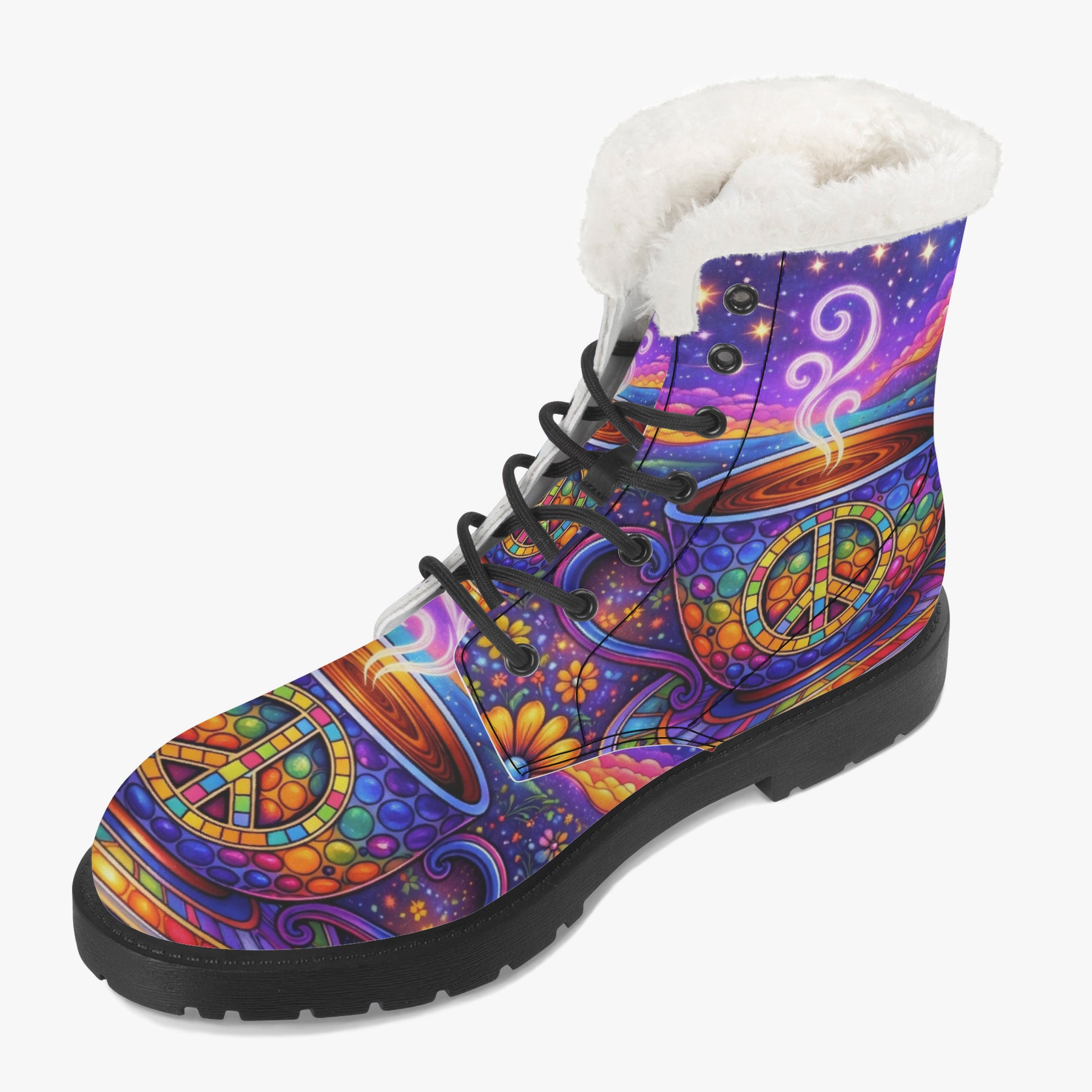 Wrap your feet in colour, calm, and conscious vibes with the Hippy Tea Cup Faux Fur Boots. Featuring radiant mosaic peace symbols, swirling steam, and dreamy cosmic florals, these boots bring warmth to your steps and light to your journey. Lined with soft sherpa and designed for everyday magic, they’re perfect for chilly mornings, sunset walks, or slow café days—inviting you to move gently, stay grounded, and carry boho bliss wherever you roam 💛🌿