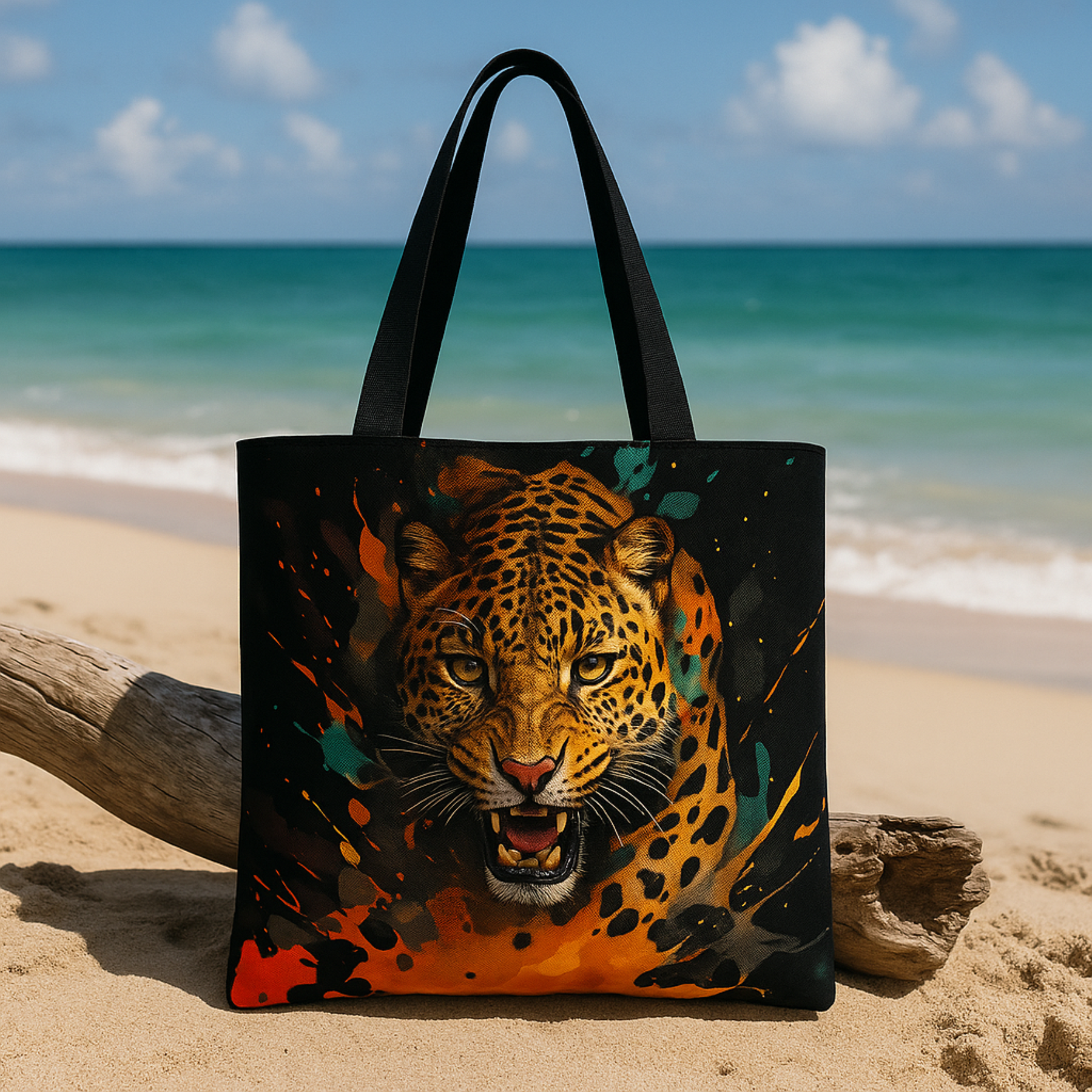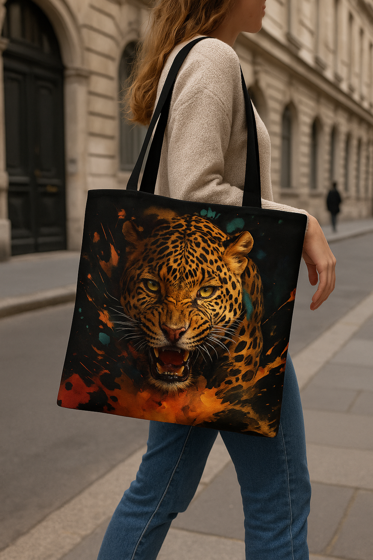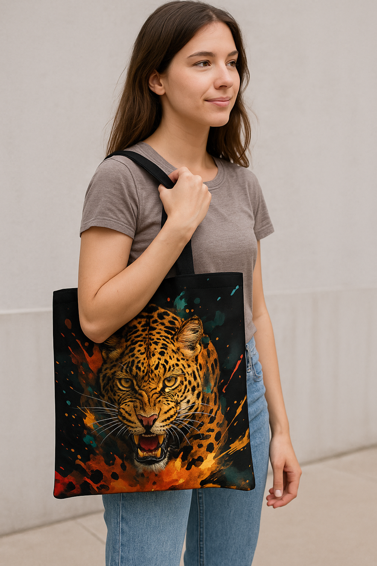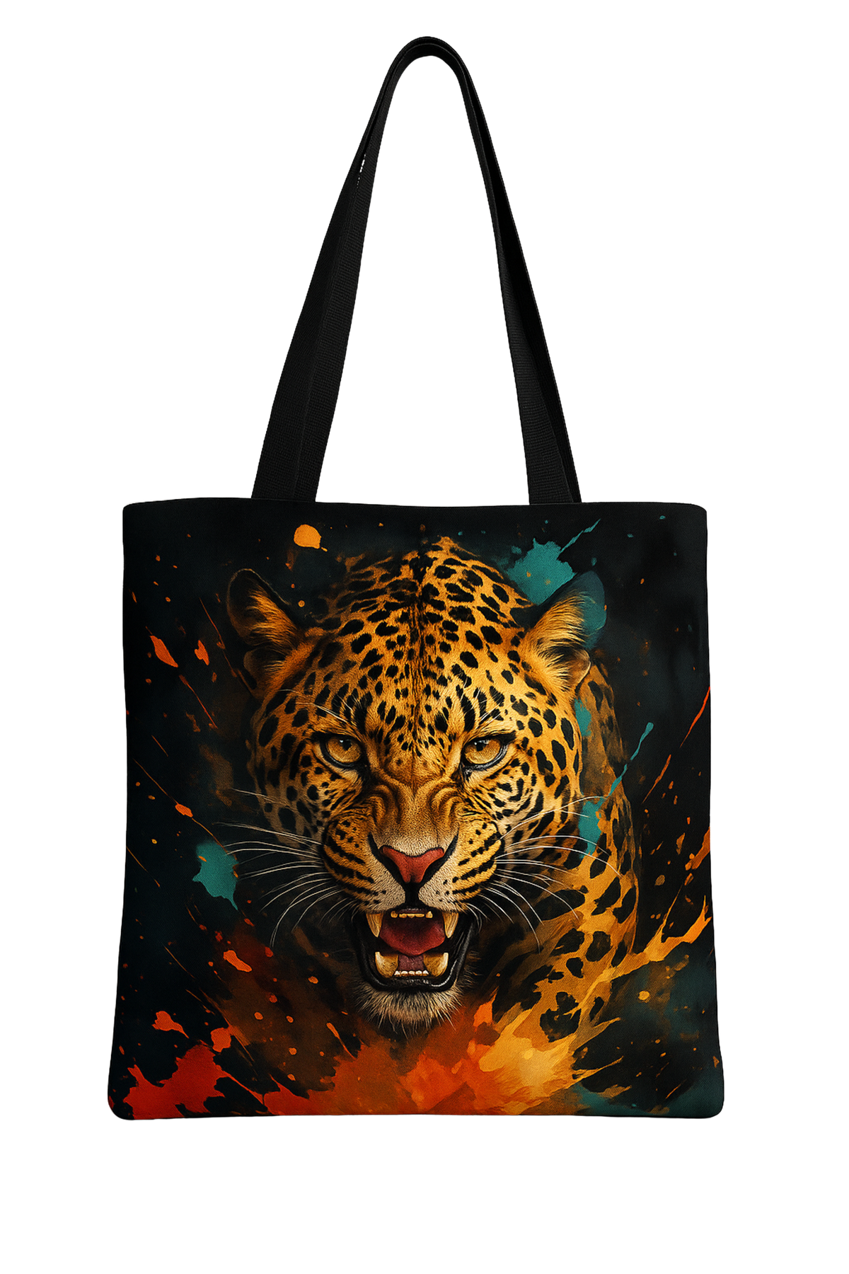 Unleash raw energy and bold artistic flare with the Ember strike Leopard Tote Bag, a fierce blend of jungle strength and fiery colour. 🔥🌑 Featuring a striking leopard bursting through splashes of orange, gold, red, teal, and electric paint streaks, this tote transforms every outing into a statement — perfect for markets, city days, beach trips, and everyday adventures. 🛍️🌆🔥