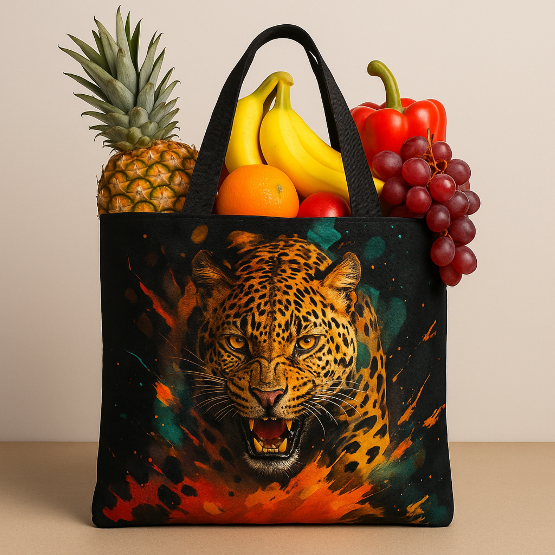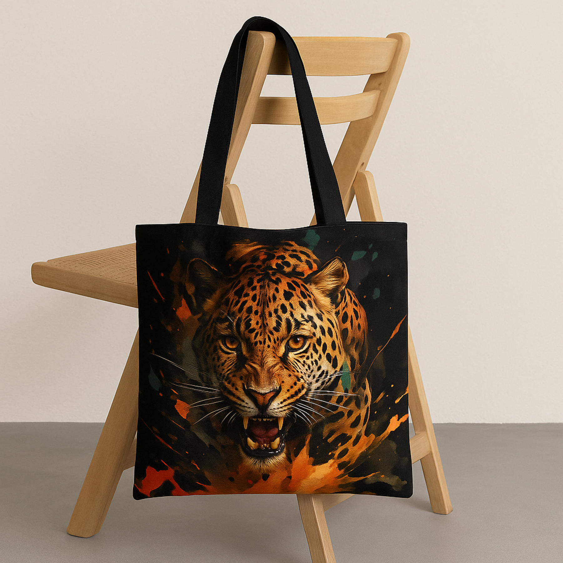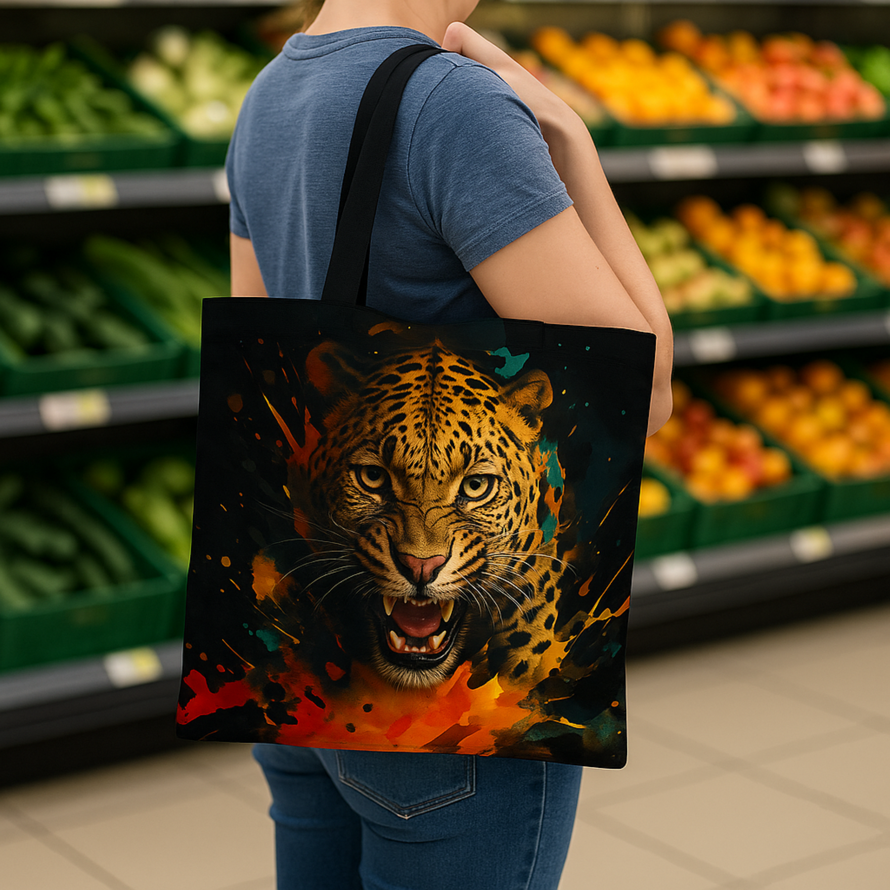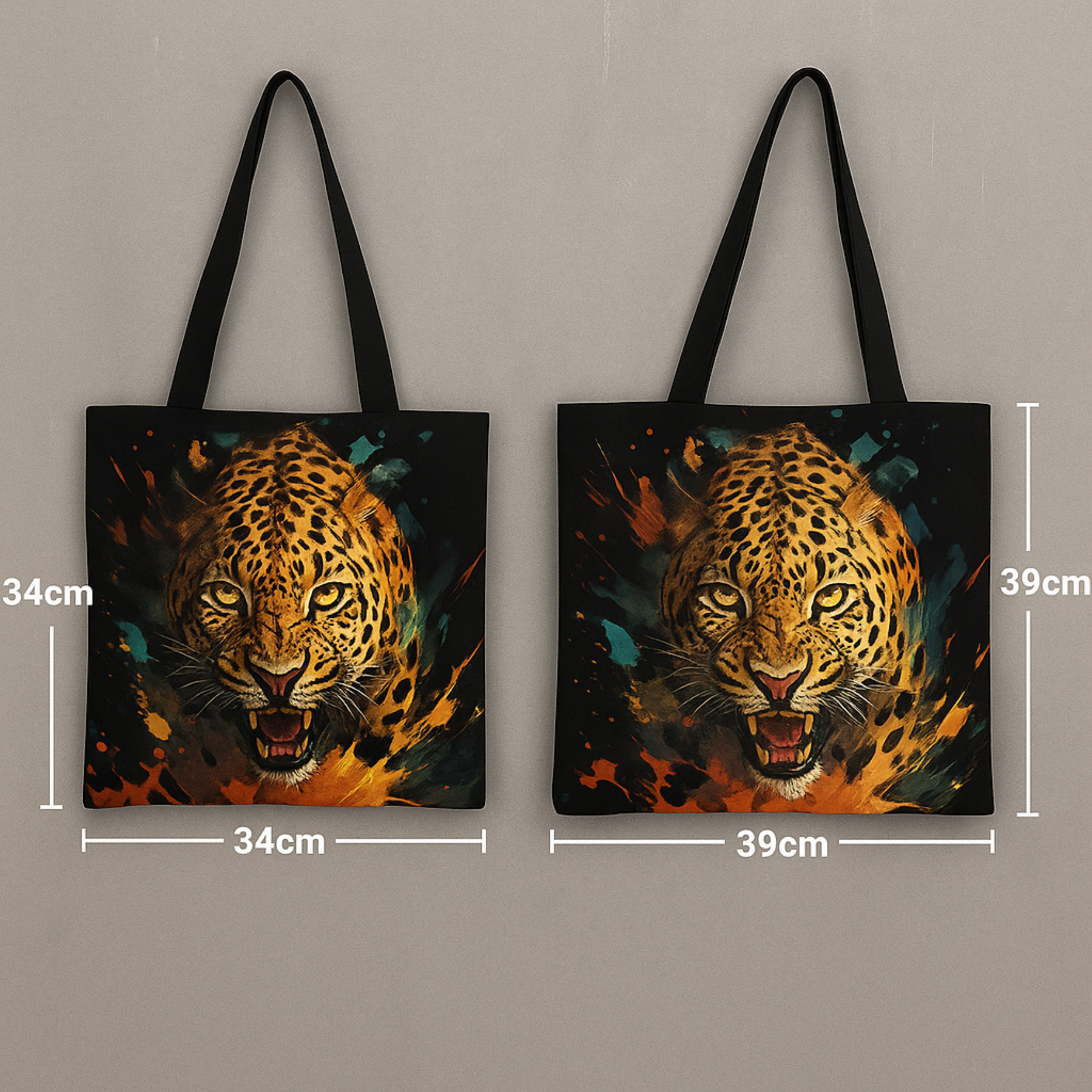 Unleash raw energy and bold artistic flare with the Ember strike Leopard Tote Bag, a fierce blend of jungle strength and fiery colour. 🔥🌑 Featuring a striking leopard bursting through splashes of orange, gold, red, teal, and electric paint streaks, this tote transforms every outing into a statement — perfect for markets, city days, beach trips, and everyday adventures. 🛍️🌆🔥