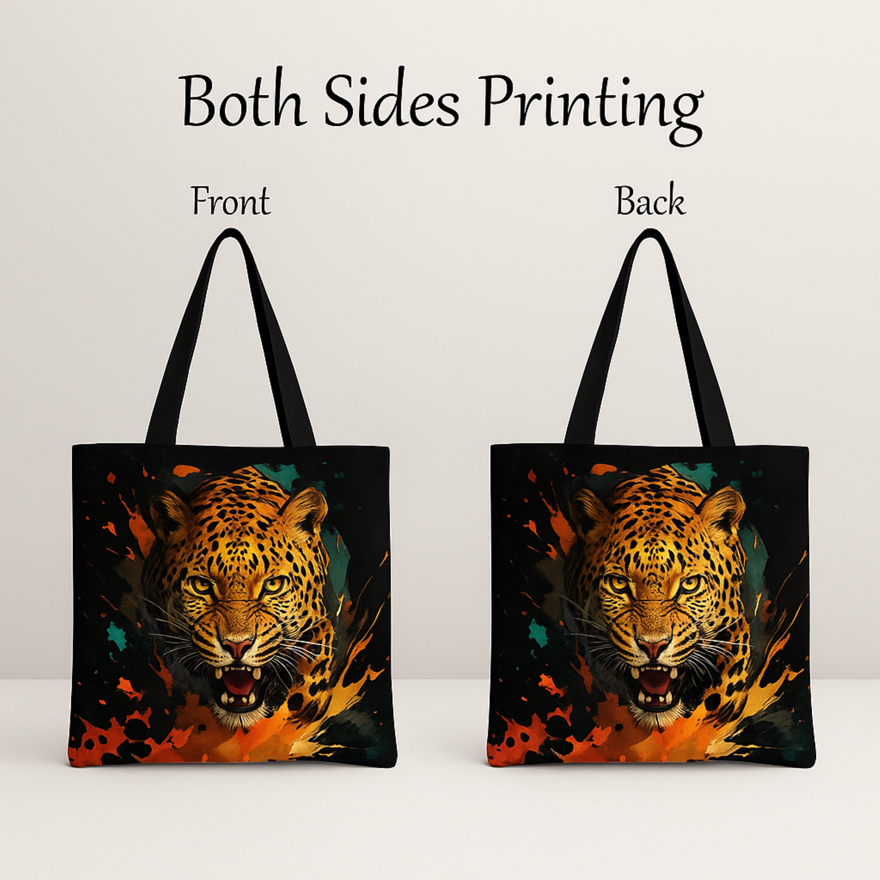 Crafted from premium canvas fabric with crisp, edge-to-edge printing, this tote is both durable and lightweight. 👜✨ The soft black straps offer comfortable all-day carry, while the spacious interior easily holds groceries, books, laptops, gym gear, beach items, or daily essentials. Whether you're a leopard lover, wild-at-heart explorer, or fan of dramatic artistic style, this tote adds fiery attitude to any outfit. 🐆⚡🌟